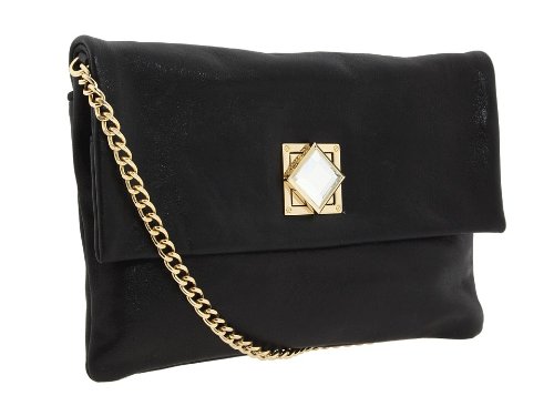 - Clear square-cut jewel accent and detailed hardware; top flap with twist-lock closure